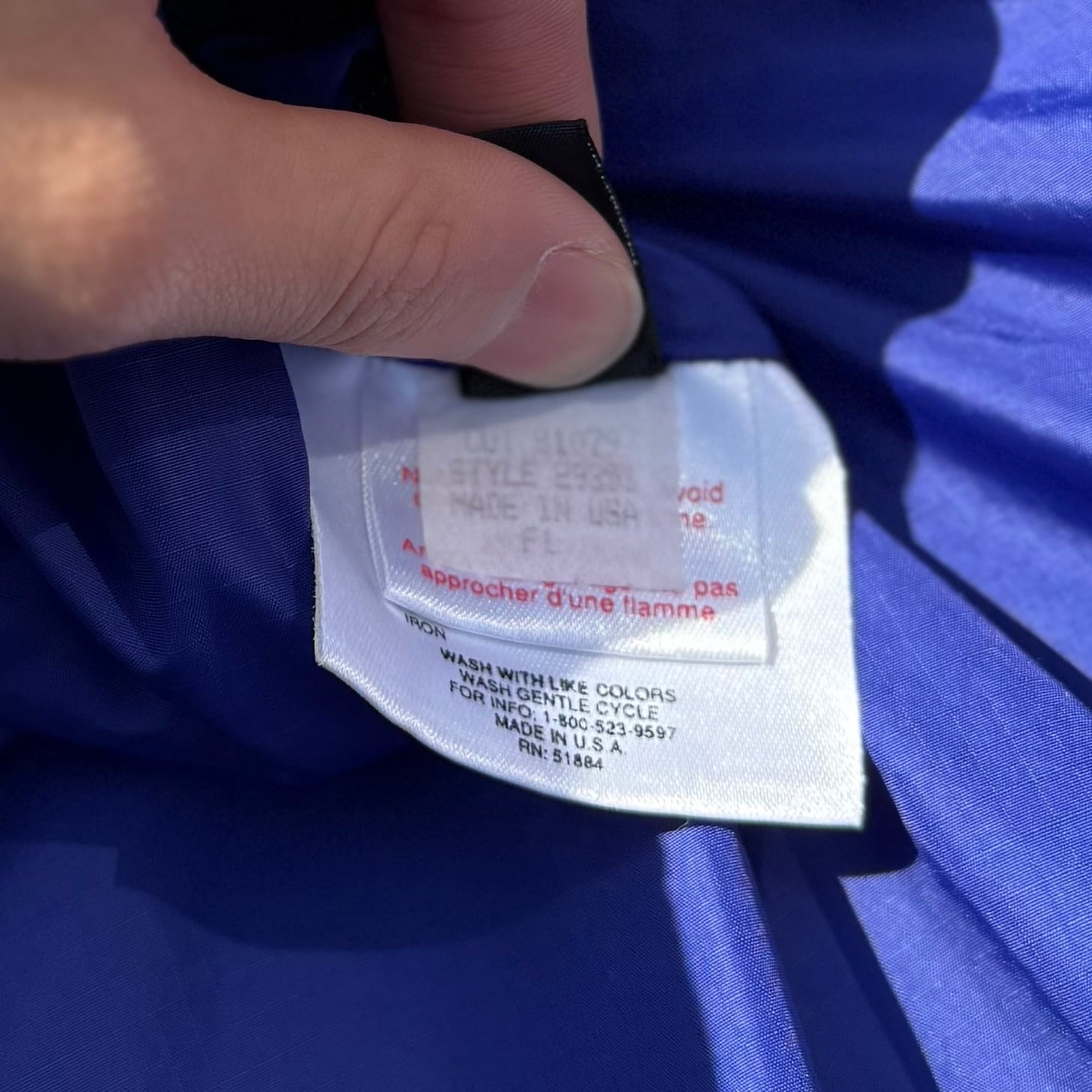 襟、袖口のブルーのパイピングが