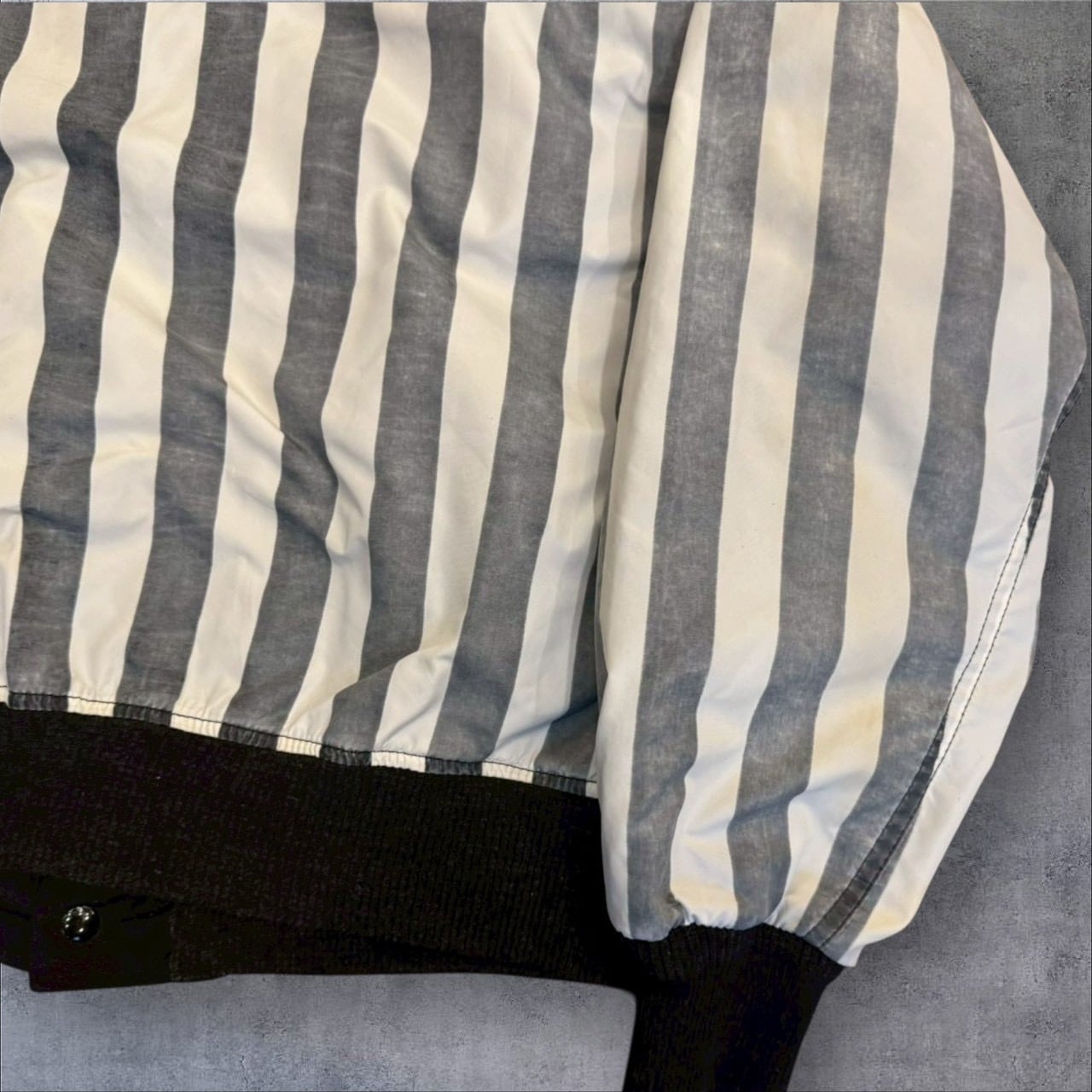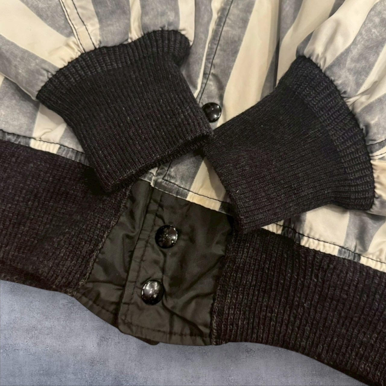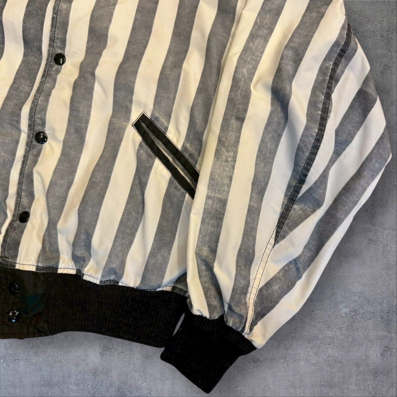 一見かなり派手で着づらい印象を持つレフェリージャケットですが、こちらは全体的にフェードが効いており、程よい主張感に収まっております。